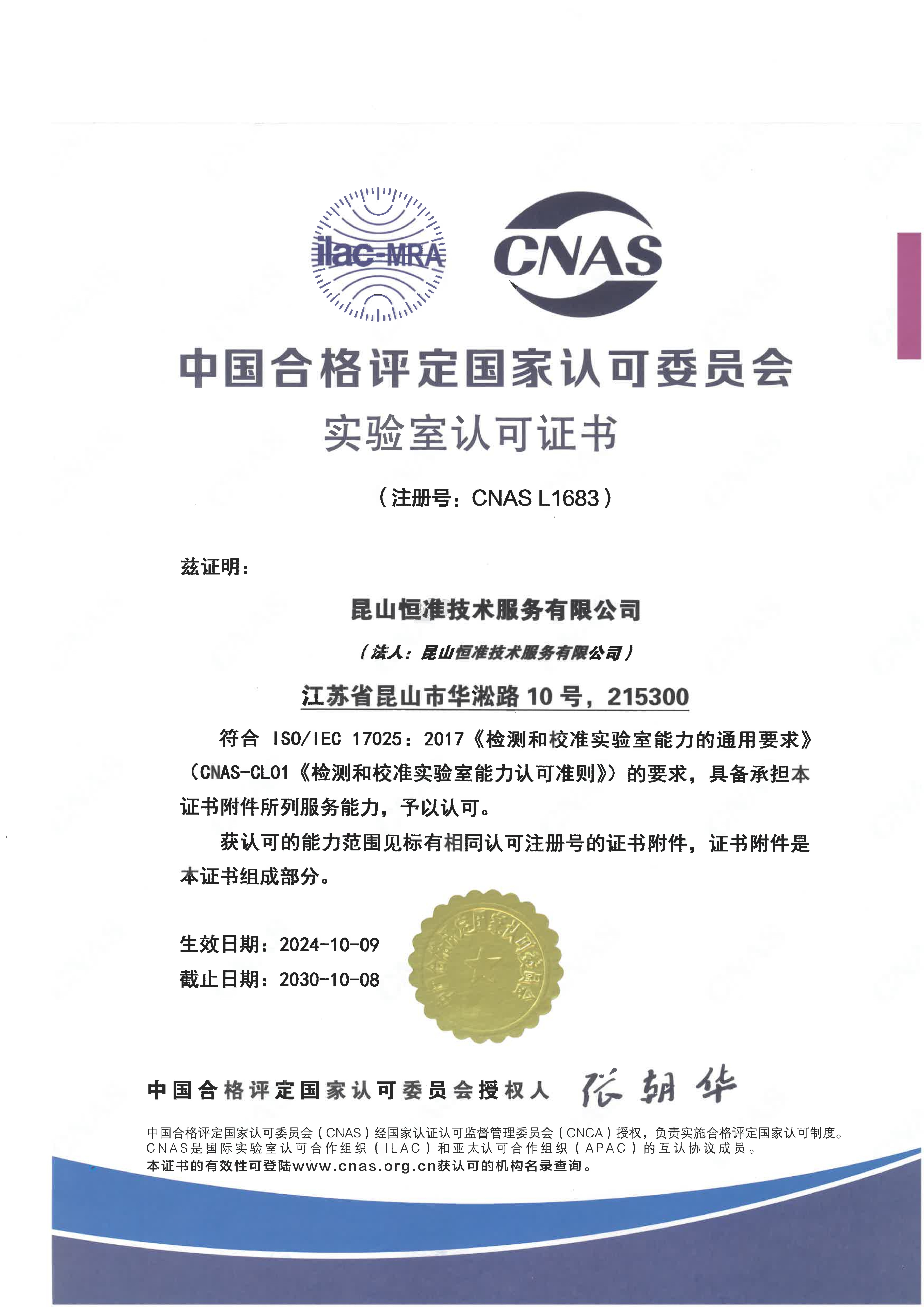 " 昆山恒準(ETS),是具外資性質校準實驗室中成立時間長、規(guī)模最大、最具影響力的專業(yè)第三方計量校準機構,出具的計量校準證書具有國際公信力. 一直潛心專注于精密儀器、設備的校準服務,執(zhí)著于『看不見的質量』,堅持『勇于負責,確實做好每一次校準工作』的服務態(tài)度,讓客戶體驗真正負責任第三方實驗室的服務理念. 目前已經獲得中國合格評定國家認可委員會(CNAS)認可項目300多項(NO.L1683),每年持續(xù)增加校準項目,提供客戶更全面服務,已累積獲得近萬家客戶的認可和大力支持.